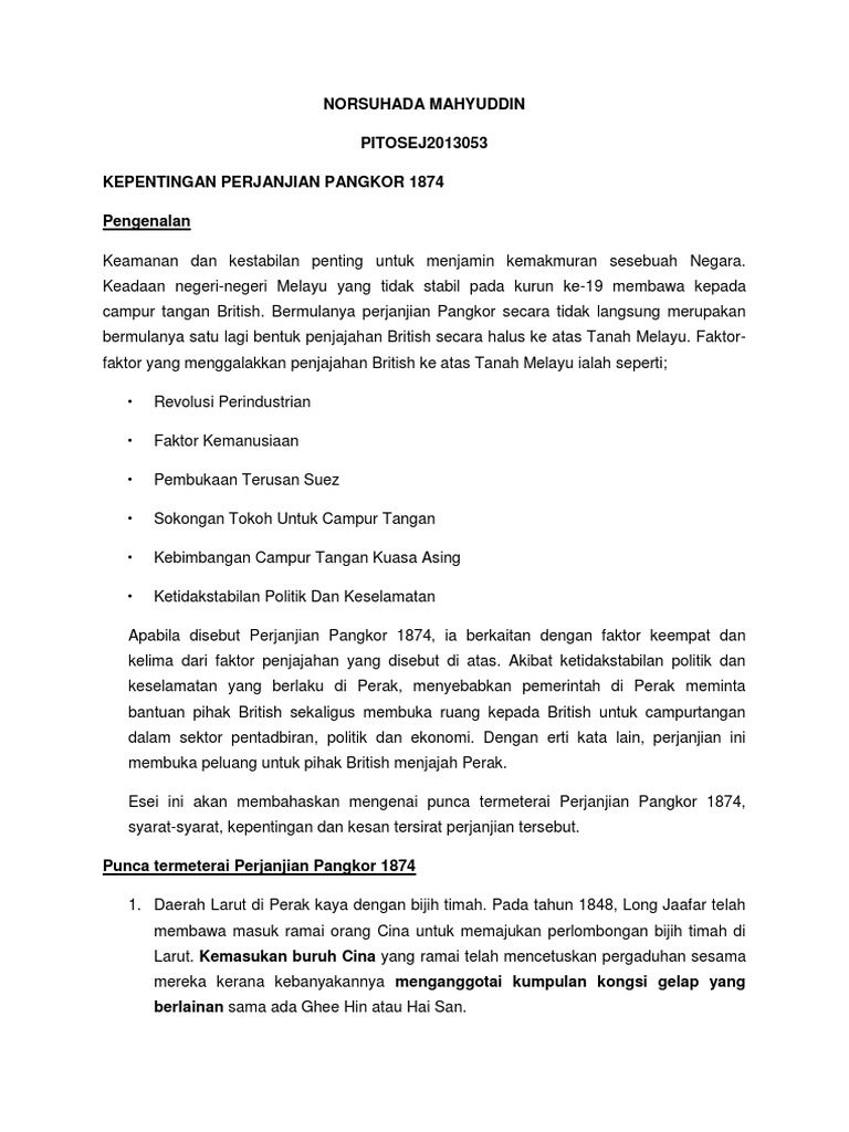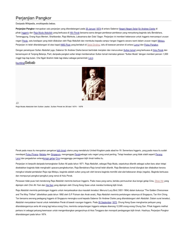 Raja bendahara ismail pemangku sultan dibenarkan memakai gelaran sultan muda dan menerima pencen serta sebuah daerah kecil diserahkan. Pangkor island is in perak, on the west coast of peninsular malaysia, about 100 km west of ipoh and halfway between kuala lumpur and penang. Godine bio je ugovor potpisan između velike britanije i sultana peraka 20. At traktaten der pulo dinding og øyene pangkor ble avgitt til storbritannia ble misforstått og at det var ønskelig å justere den samme for å gjennomføre intensjonen til framer, erklæres herved at grensene av nevnte. Ugovor je značajan u povijesti malajskih država jer je ozakonio britansku kontrolu nad malajskim vladarima i otvorio put britanskom imperijalizmu u.